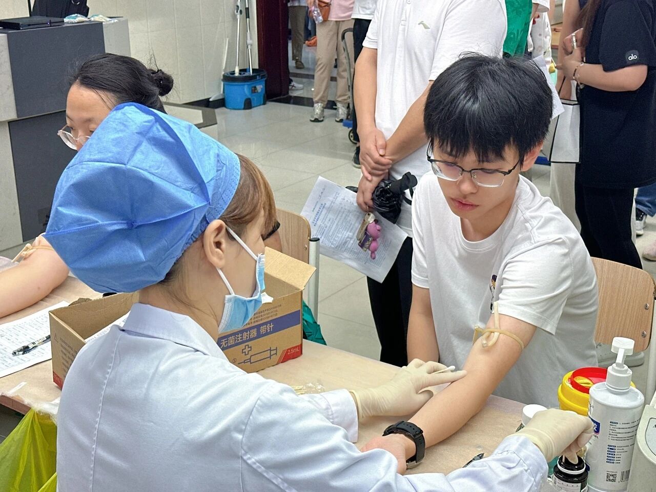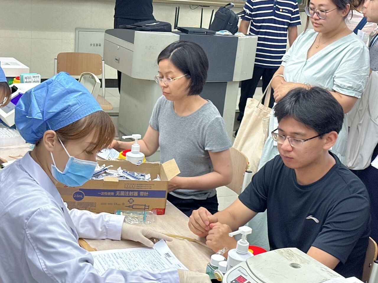 到达现场后,老师们在工作人员引导下,依次有序地进行信息登记、健康体检与血液初筛。整个过程严谨、高效,展现了潞河教师队伍良好的组织纪律性和从容奉献的精神面貌。