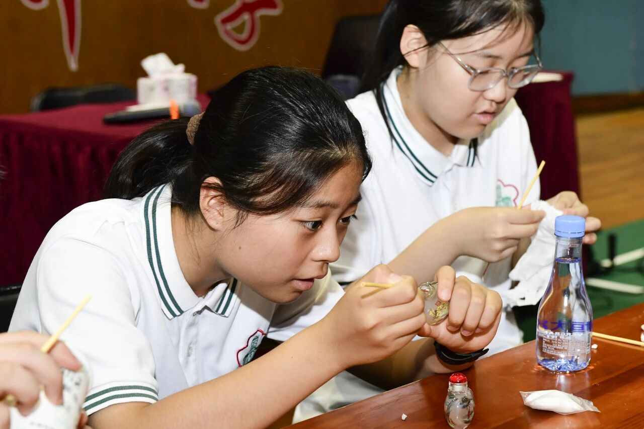 方寸乾坤·内画艺术:在国家级内画艺术家刘恒老师及其团队的指导下,同学们屏息凝神,尝试在晶莹剔透的壶胚内壁反手作画。指尖轻触,笔尖游走,方寸之间勾勒万千世界,同学们惊叹于这门技艺的匠心独运与精妙绝伦。