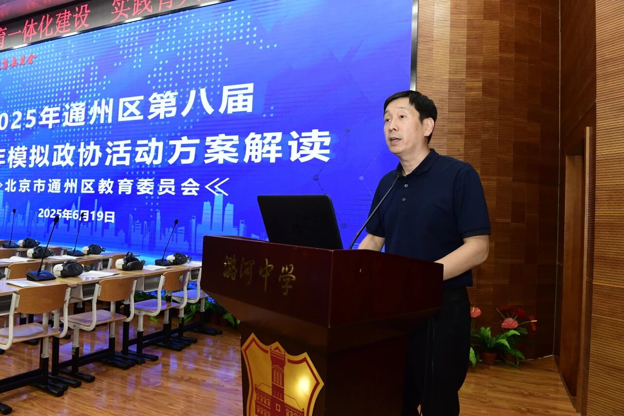 通州区教委中教科科长、潞河中学党委书记张旭东对通州区第八届青少年模拟政协活动方案进行了解读,以副中心发展为依托,增强学生社会责任,坚持守正创新,推动实践育人高质量发展。