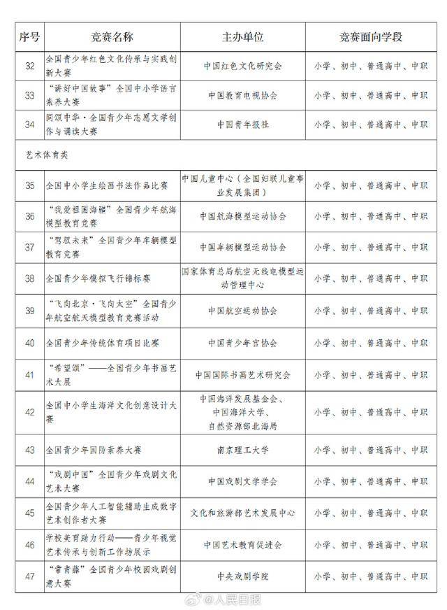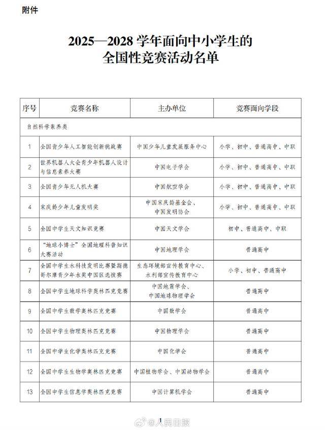 教育部办公厅关于2025—2028学年面向中小学生的全国性竞赛活动名单的公示