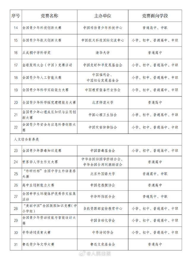 根据《教育部办公厅等四部门关于印发的通知》(教监管厅函〔2022〕4号)精神,由主办单位自主申报,经组织专家进行严格评审把关,拟确定全国青少年人工智能创新挑战赛等47项竞赛为2025—2028学年面向中小学生开展的全国性竞赛活动,举办时间原则上为2025年9月至2028年8月,在此期间每学年举办不得超过1次,累计不超过3次。现就相关信息予以公示,公示期为2025年9月11日至17日。