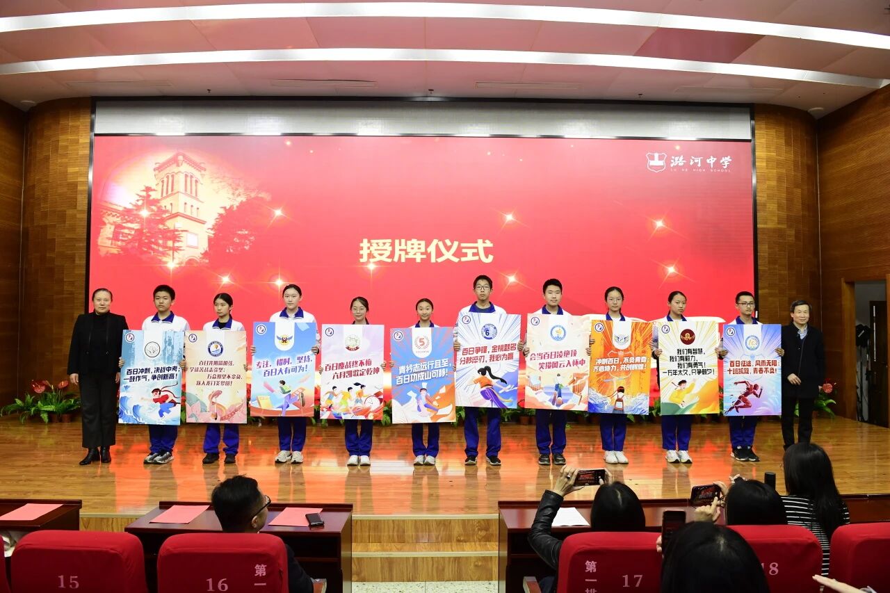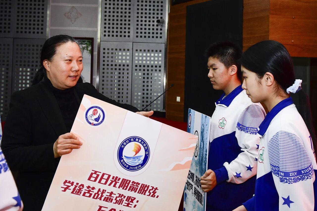 在雷鸣般的掌声中,谢宏春副校长与李晨松副校长为各班授予百日宣誓牌。镌刻各班标语的宣誓牌化作冲锋的战鼓。各班班长高举宣誓牌的挺拔身姿,凝成初三学子勇毅前行的精神图腾。