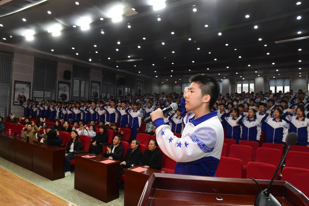 初三1班许嘉毅随即登台领誓,全体学子右拳紧贴心脏,以裂石穿云之势齐诵誓词:"勤学苦练,百炼成钢!以我热血,书写青春!"铮铮誓言与少年们眸中的灼灼星火交相辉映,在礼堂上空铺展出一幅气吞山河的青春长卷。