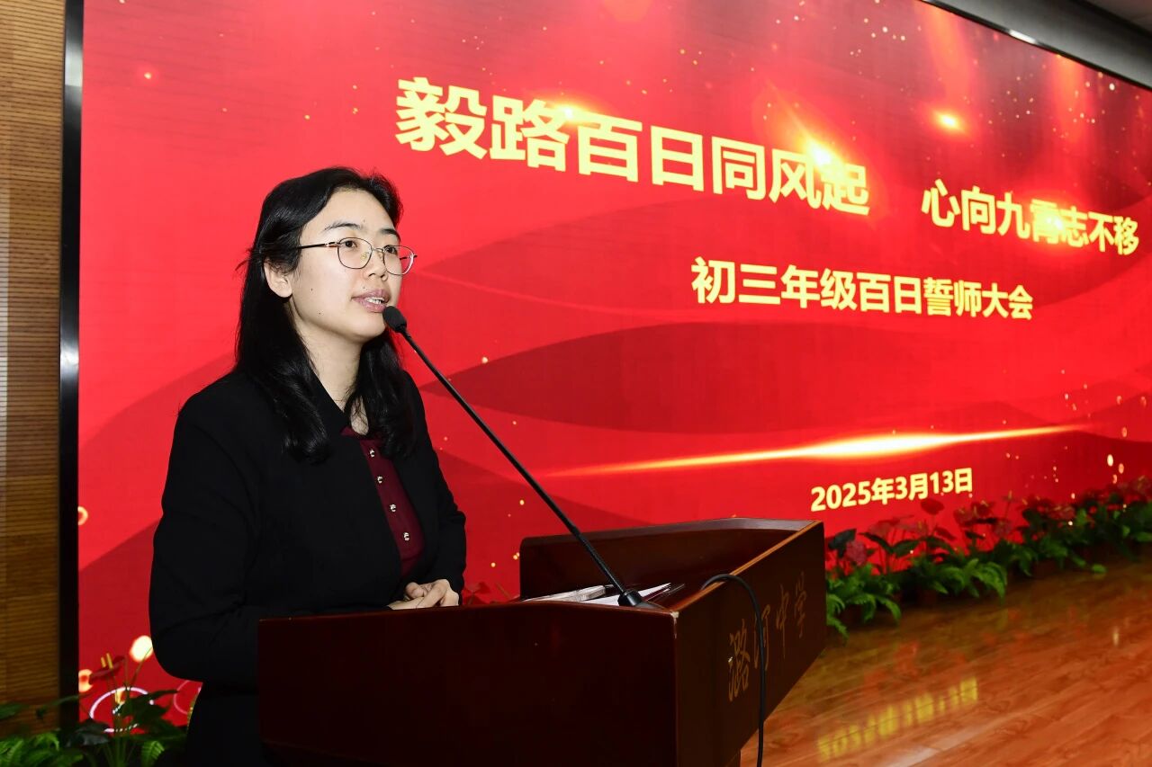 接下来,初三教师团队以诗朗诵《百日征途,与你并肩》倾吐心声。三尺讲台上的引路人化身为追梦守护者:"做永不熄灭的火把,照亮你们前行的花路!"铿锵的诗句与经久不息的掌声交织,为学子注入奋进的力量。