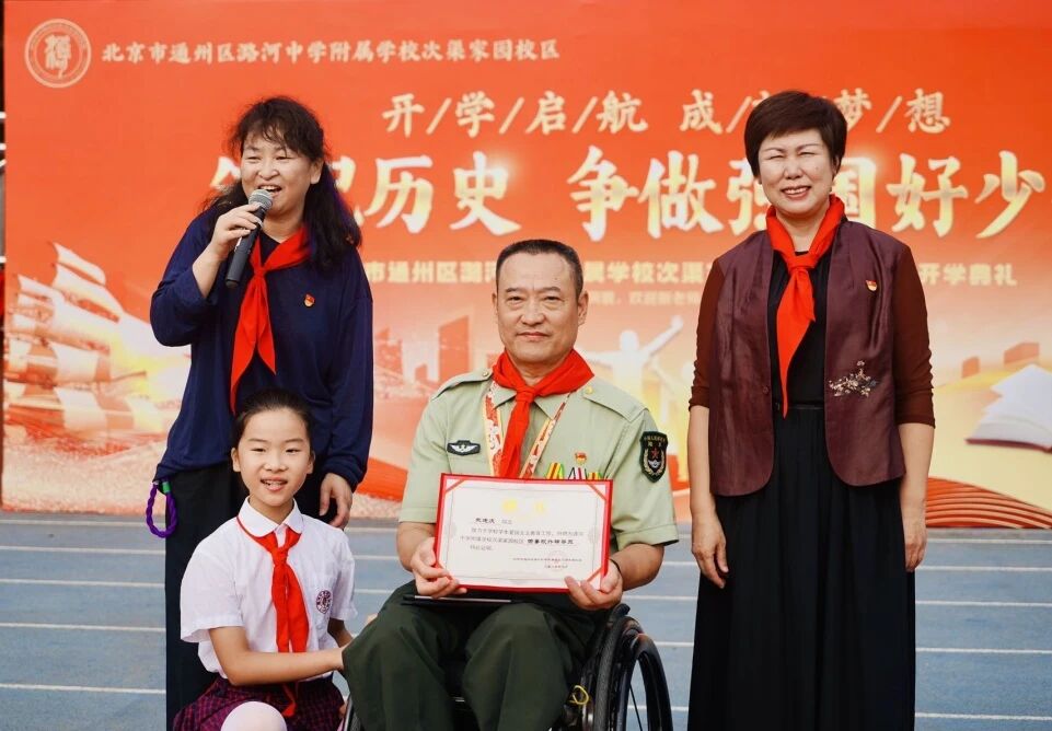 战斗英雄武连庆亲临现场,与少先队员们分享革命故事,他以历史亲历者的视角,引导队员们理解幸福生活的来之不易,勉励队员们勤学本领、报效祖国。少先队员代表赵稀乔敬献领巾,学校党支部书记、校长商学芳为武连庆颁发聘书。